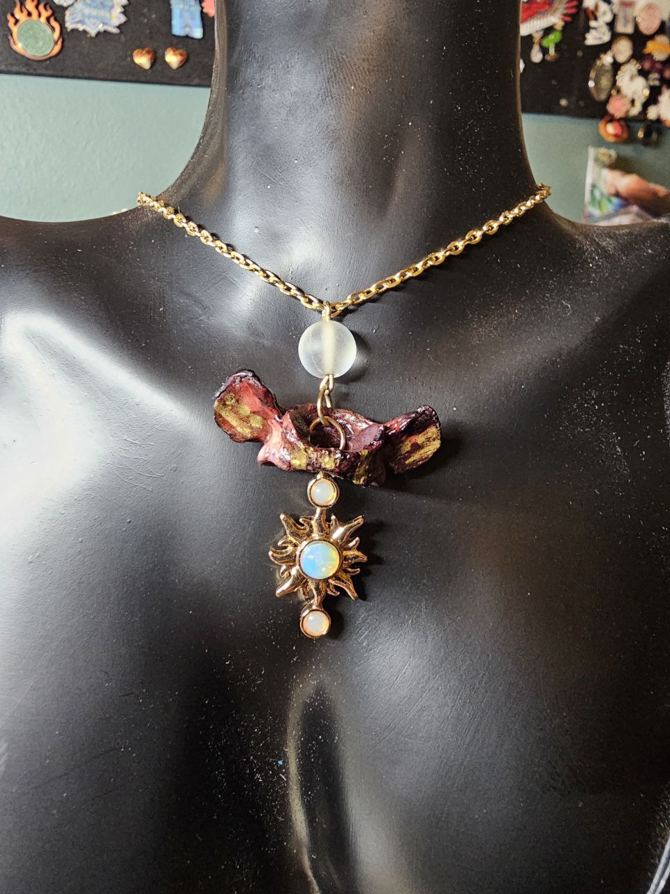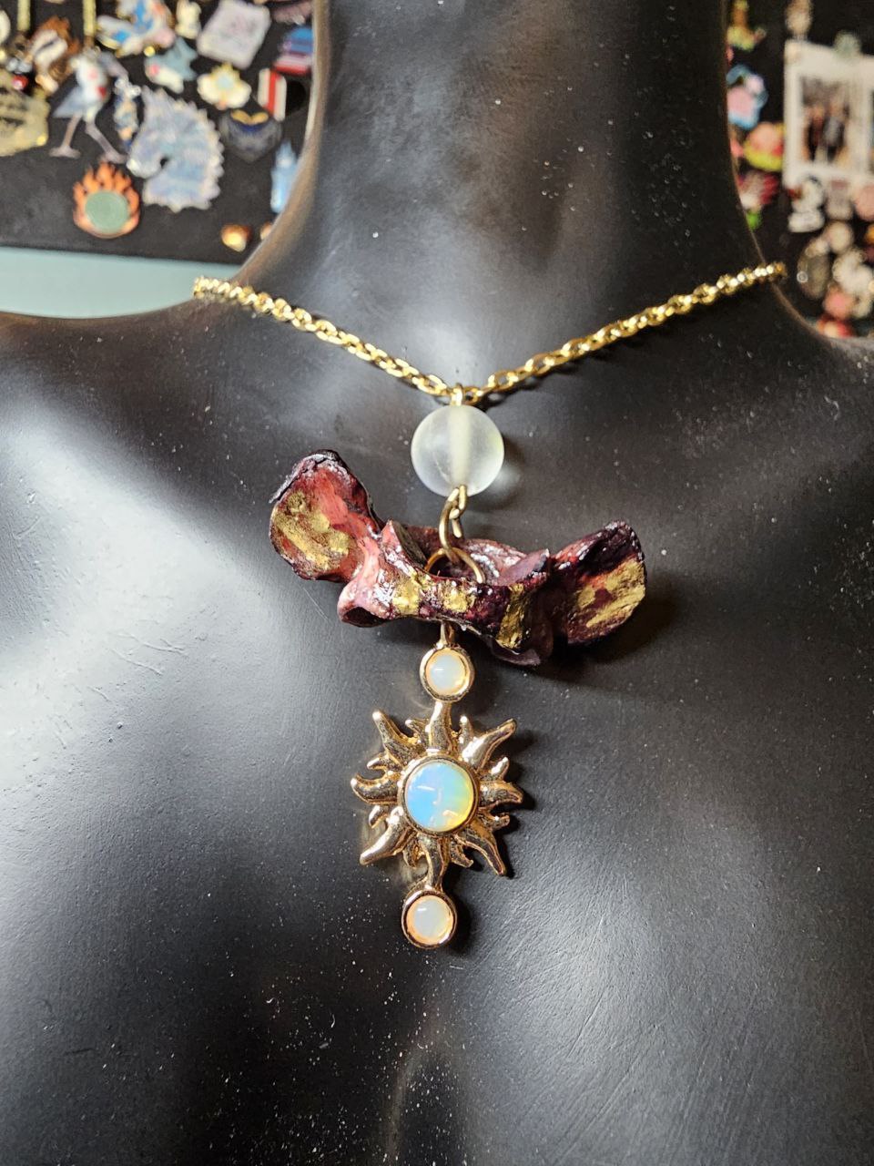 Crafted from genuine cervical spine vertebrae, this unique piece is meticulously dyed red and sealed to preserve its vivid color. Highlighted with elegant gold accents and featuring a gold sun bead accented by a luminous opalite stone, it offers both scientific intrigue and refined craftsmanship. Suspended on a durable gold chain, the Cervical Spine Sunshine combines authentic anatomical elements with sophisticated design, making it a distinctive accessory for collectors and enthusiasts alike.